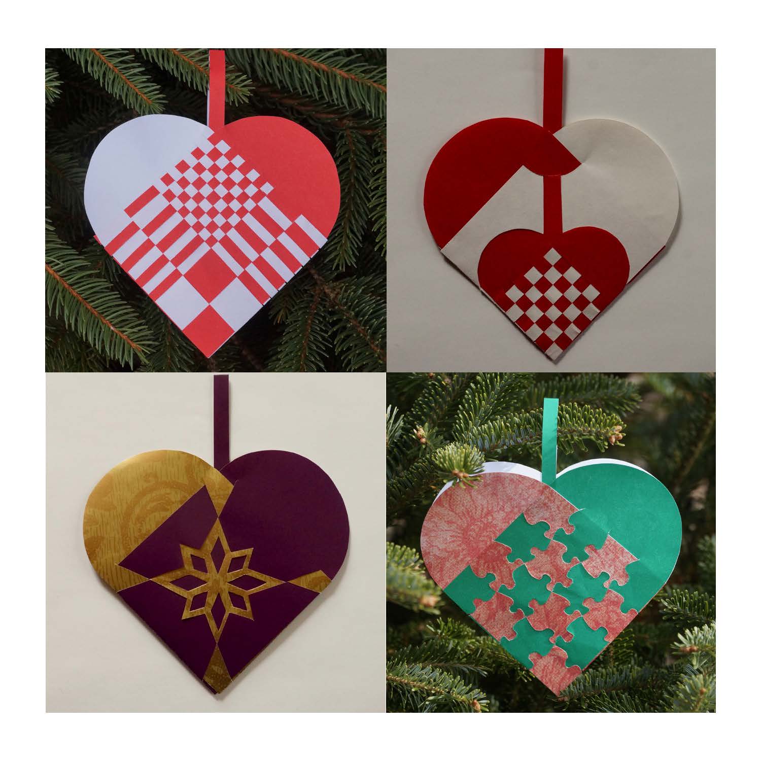 Learn the traditional Scandinavian craft of woven paper hearts, beginning with the classic red-and-white nine-patch design and progressing to a variety of patterns using different strip widths, inset shapes, stars, cut-outs, and patterned papers. Once comfortable with the basics, students may explore more intricate or freeform designs.